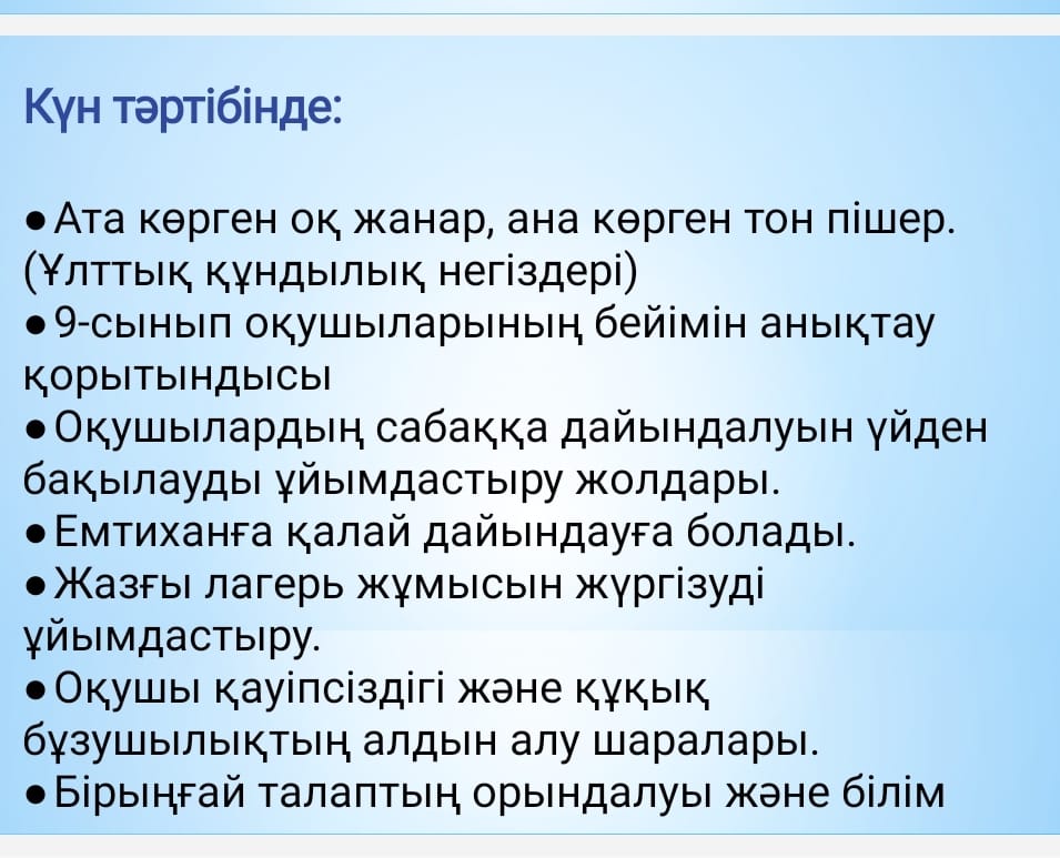 08.04 күні 1 орта мектепте жалпы ата-аналар жиналысы өтті. Тақырыбы: "Оқушыны бейіміне қарай дамыту заман талабы".