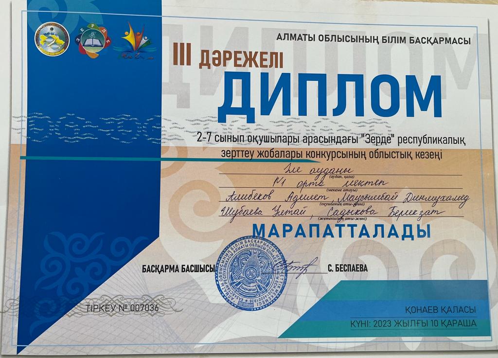 2-7 сынып оқушылары арасындағы "Зерде" республикалық зерттеу жобалары конкурсының облыстық кезеңіне қатысып, Алибеков Адилет пен Маусымбай Дінмұхамед ІІІ орын иеленді. Жетекшілері Шубаева Ултай Қудайбергеновна және Садықова Берикзат Сайдыгалиевна.