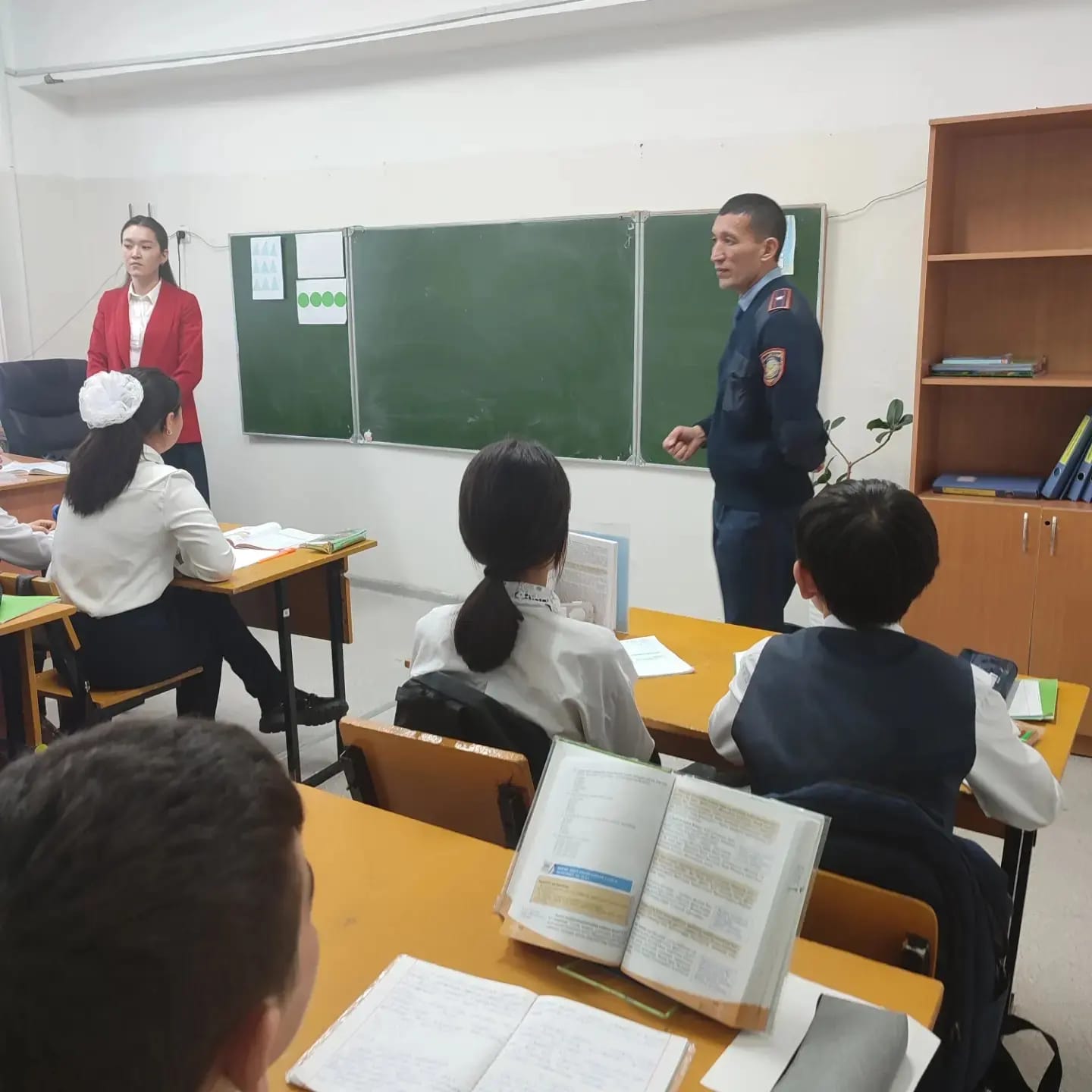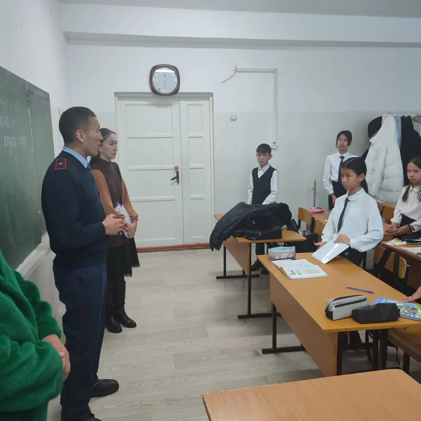 Кәмелеттік жасқа толмаған жасөспірімдер арасында құқықбұзушылықтың алдын-алу мақсатында мектеп инспекторы Д.Т.Тұрлыбеков мектеп оқушыларымен кездесіп, түсіндіру жұмыстарын жүргізді