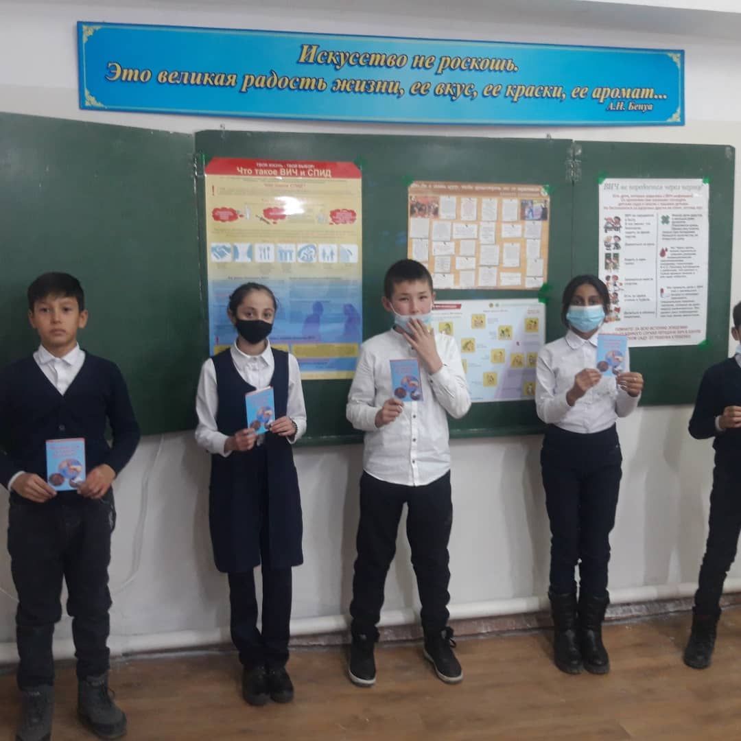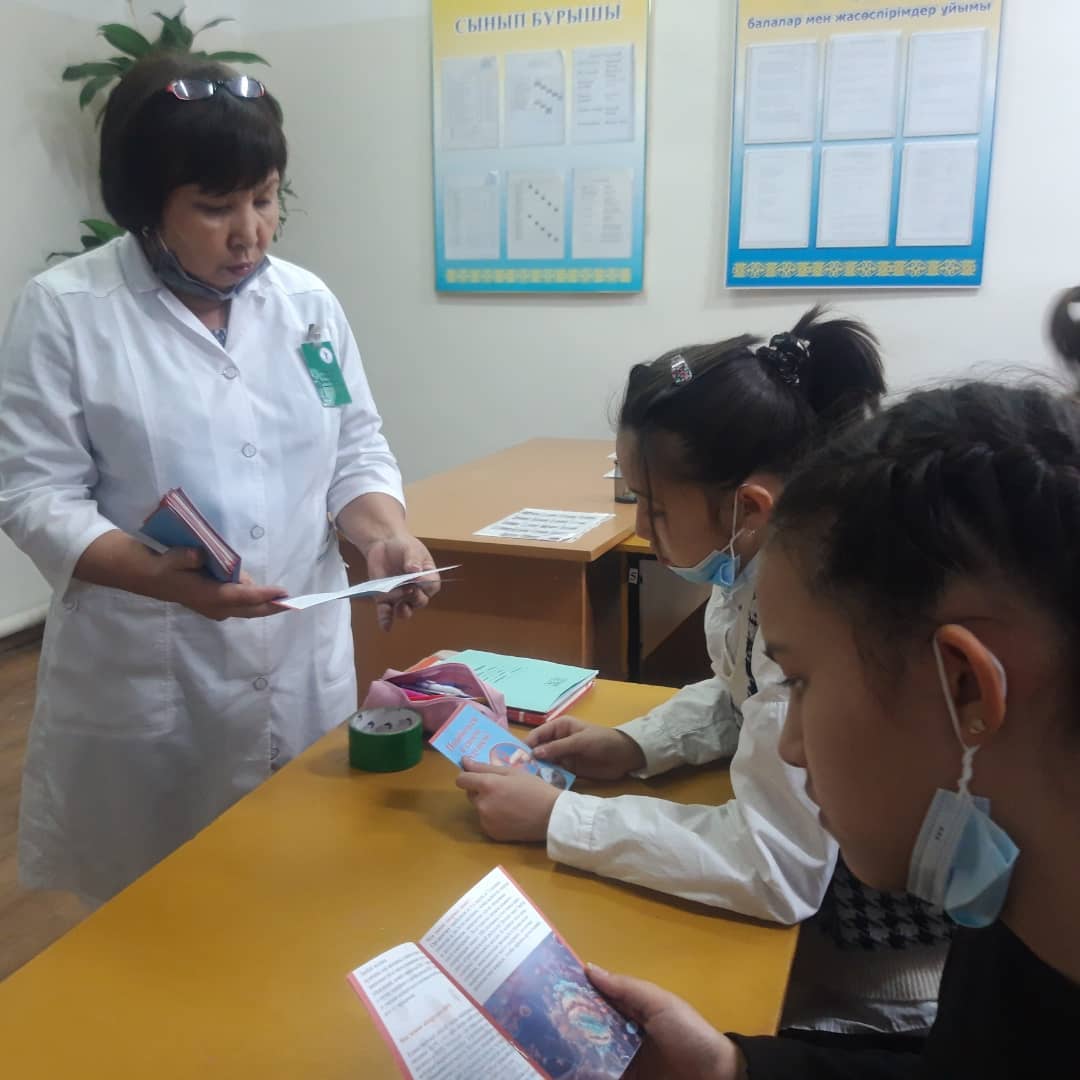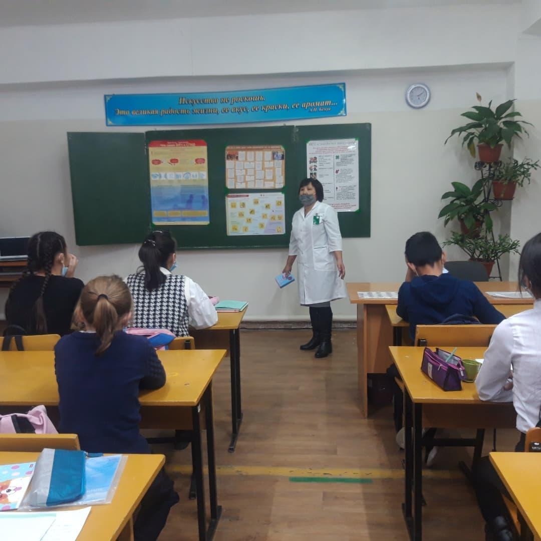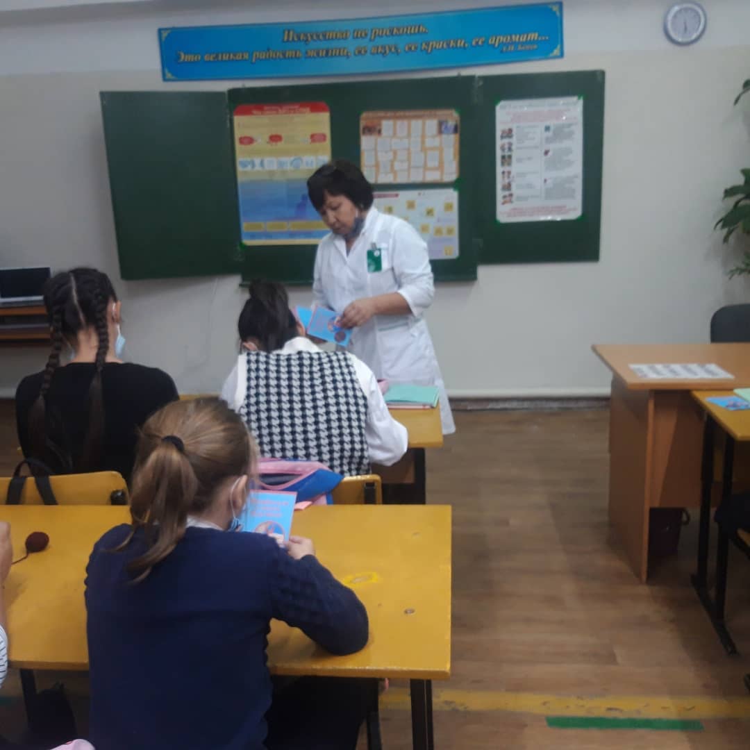 Алматы облысы Іле ауданы Қоянқұс ауылы 1 орта мектебінің медбикесі Р. Солтанбекова 6 "В" сыныбында 1 желтоқсан - Дүниежүзілік СПИДке қарсы күрес күнін