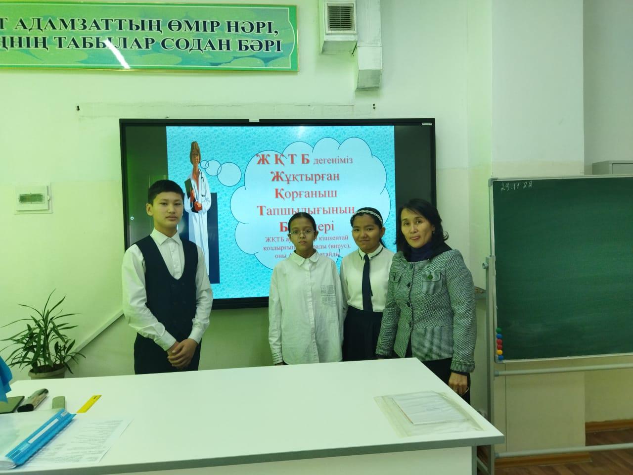 1 – желтоқсан, Бүкілдүниежүзілік ЖҚТБ-ға қарсы күнге байланысты 7 «Ә» сыныпта тәрбие сағаты өтті. Оқушыларға ЖҚТБ – ның қазіргі таңдағы адамзаттың басты проблемасы екенін, оның зиянды жақтарын түсіндіре отырып, ғасыр дертіне айналып отырған кеселдің залалдарын жан-жақты меңгеру, зиянды әдеттерден бойын аулақ ұстауға шақырды. Сынып жетекшісі Бейсенова Жандаркул Жұмабайқызы ЖҚТБ-ның адам өміріне зиянды әсерін айта отырып, салауатты өмір суруге үйретті. Денсаулықты сақтау, болашақтың жарқын болуы екенін ұмытпайық.