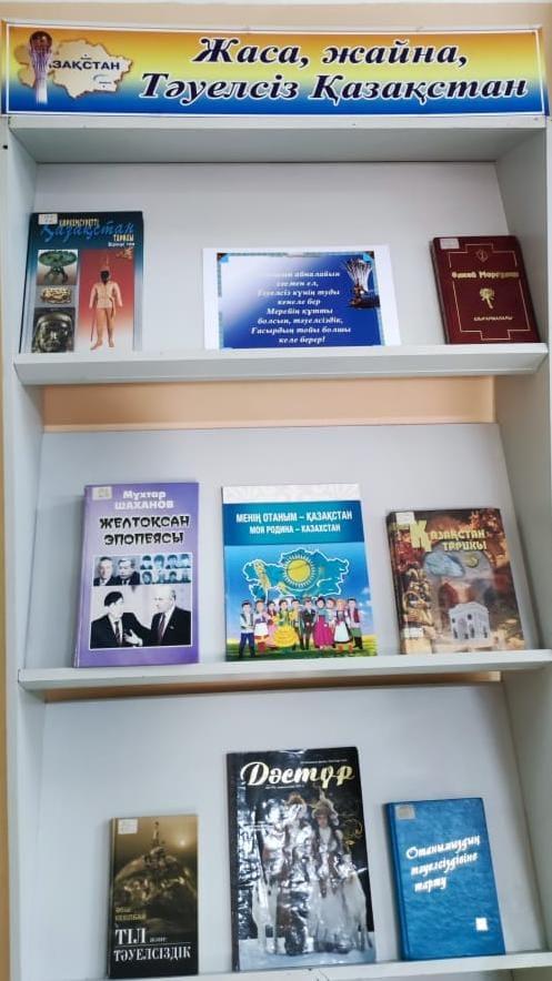 12.12.2022 жылы №1 орта мектеп кітапханашылары Ел Тәуелсіздігінің 31 жылдығына орай « Жайна , жаса Тәуелсіз Қазақстан »  тақырыбында кітап көрмесі ұйымдастырылды. Кітап көрмесінің мақсаты Тәуелсіздік тарихына шолу жасау. Оқушыларды елжандылыққа, Отансүйгіштікке баулу. Кітап көрмесінде еліміздің Тәуелсіздігін алу жолындағы кезеңінен сыр шертетін тарихи әдебиеттер  насихатталды.