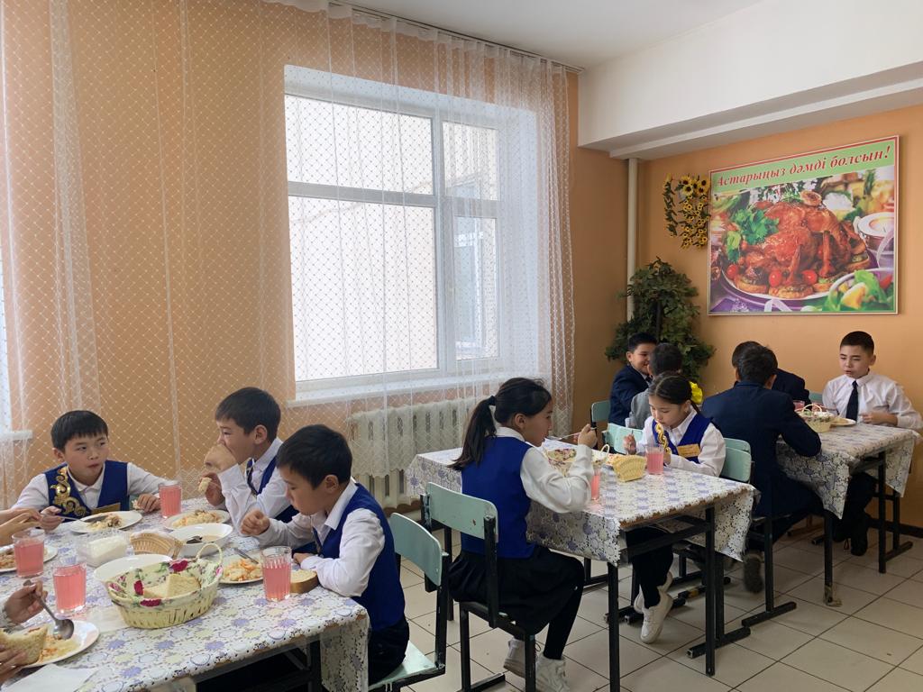2022-2023 оқу жылында мектеп ішінде 82 бала ЖББ корынан ыстык тамақ ішуге ұсынылды. Олар көпбалалы отбасы, аз қамтылған отбасы және жетім балалардың ішінен педагогикалық кеңесте іріктелініп алынды.Мектептегі жалпы оқушылар саны 602 бала. Соның ішінде 82 бала ЖББ корынан тамақтанса, 10 бала асхана жалдаушысының есебінен тамақтанады. Тамақтану тізіміндегі оқушылар тізімінде - 67 бала көп балалы, 10 -бала толық емес, 2-бала жетім, 3- бала аз қамтылған отбасынан шыққан. Балаларды іріктеуде баланың әлеуметтік жағдайы ескерілді. Балалардың дұрыс тамақтануын, сонымен қоса күнделікті тамақтануы қадағаланып отырады.Тиым салынған Асхана оқушылар тамактану үшін 30 орынға есептелген, буфет жұмыс істейді.