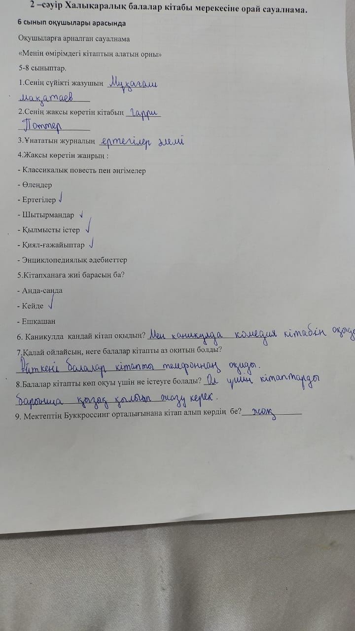 № 1 орта мектеп кітапханасында   "2-сәуір Халықаралық балалар кітабы күні"мерекесіне орай кітап көрмесі ұйымдастырылды. Жыл сайын тойланатын кітап мерекесінің басты мақсаты жас оқырмандарды рухани азық көзі-кітап әлемімен таныстыру, балаларды көркем әдебиет оқуға шақыру, адам өміріндегі кітаптың алар орны ерекше екенін түсіндеру. Кітап көрмесі 1-4,5-7 сынып оқушыларына насихатталып көрмедегі әдебиеттерге кітапханашы Аян Нұраханқызы шолу жасады. Іс-шара барысында ұсынылған 21 әдеби кітаптан кітап оқуға қызыққан оқушылар өздеріне үйге оқуға кітаптар алды. Балалар кітабы мерекесіне орай 6-7 сынып оқушылары арасында кітапханалық сауалнама жүргізілді. Сауалнамада оқушылар өздері сүйіп оқыған  кітаптары  жайлы сұрақтарға жауап берді. Балалар кітабы апталығы апта соңына дейін жалғасын табады.
