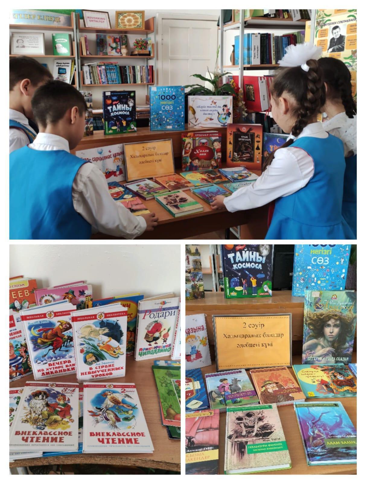 Іс-шара барысында кітапхана қызметкерлері балаларды кітап көрмесіндегі әдебиеттермен таныстырып шықты. Оқушылар Халықаралық кітап күнінің тарихымен жақын танысып , Г.Х.Андерсеннің өмірбаяны және оның керемет ертегілері туралы көптеген қызықты мағлұматтар алды