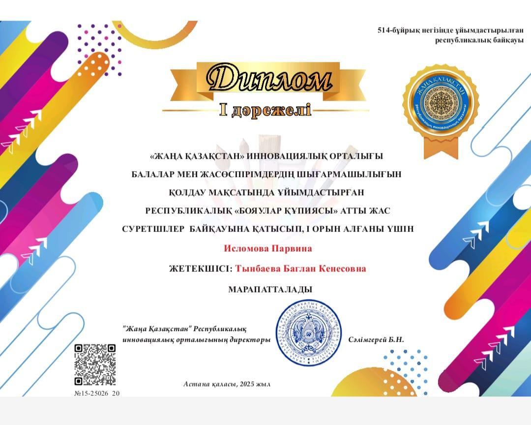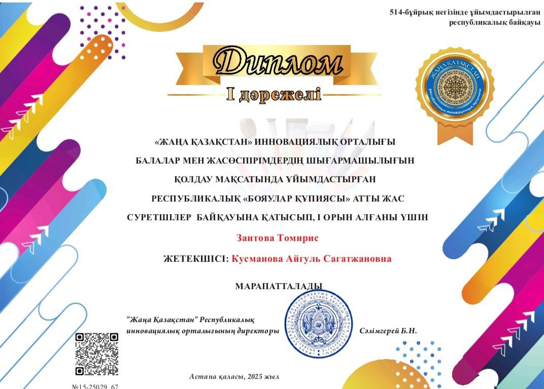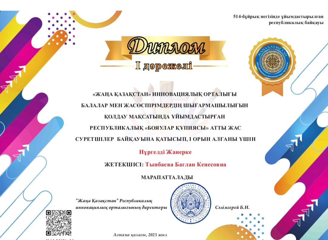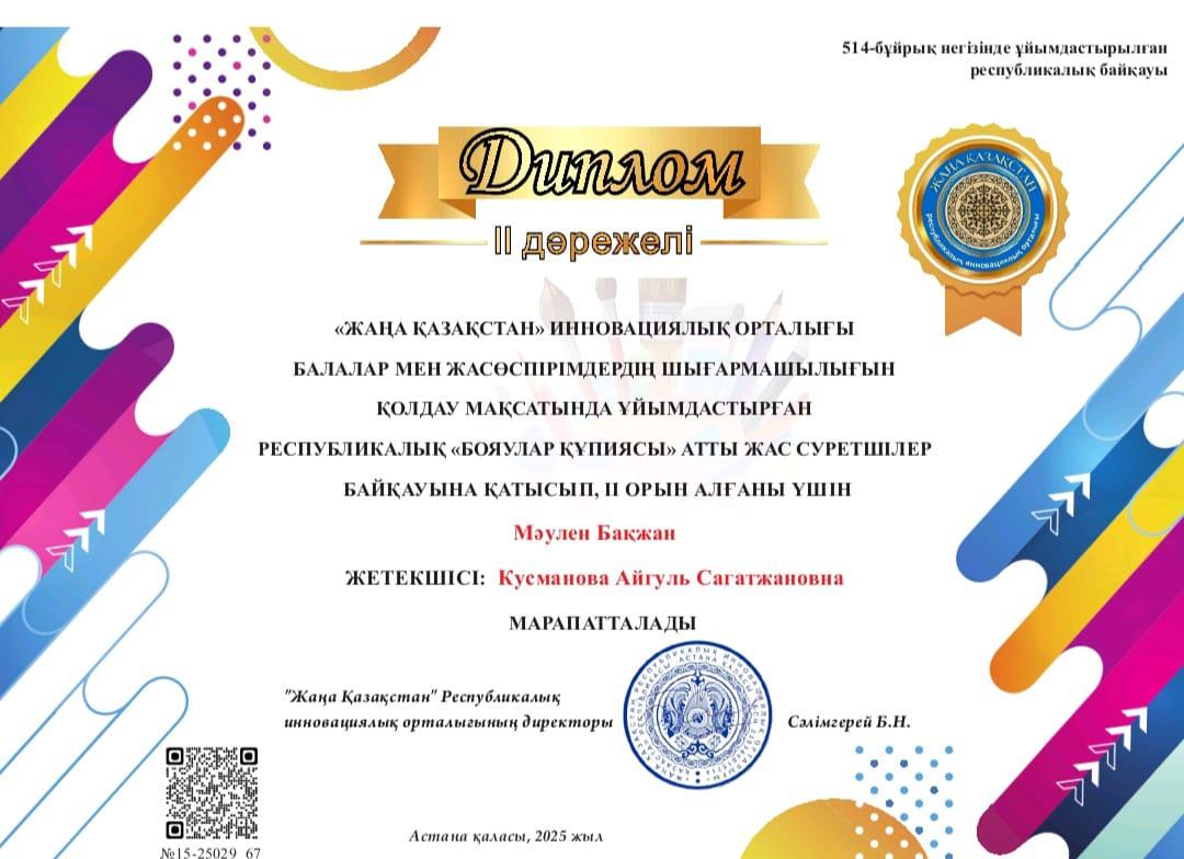 Алатау қаласы Қоянқұс шағын ауданы «№13 орта мектеп» КММ оқушылары «ЖАҢА ҚАЗАҚСТАН» ИННОВАЦИЯЛЫҚ ОРТАЛЫҒЫ БАЛАЛАР МЕН ЖАСӨСПІРІМДЕРДІҢ ШЫҒАРМАШЫЛЫҒЫН ҚОЛДАУ МАҚСАТЫНДА ҰЙЫМДАСТЫРҒАН РЕСПУБЛИКАЛЫҚ «БОЯУЛАР ҚҰПИЯСЫ» АТТЫ ЖАС СУРЕТШІЛЕР БАЙҚАУЫНА қатысып